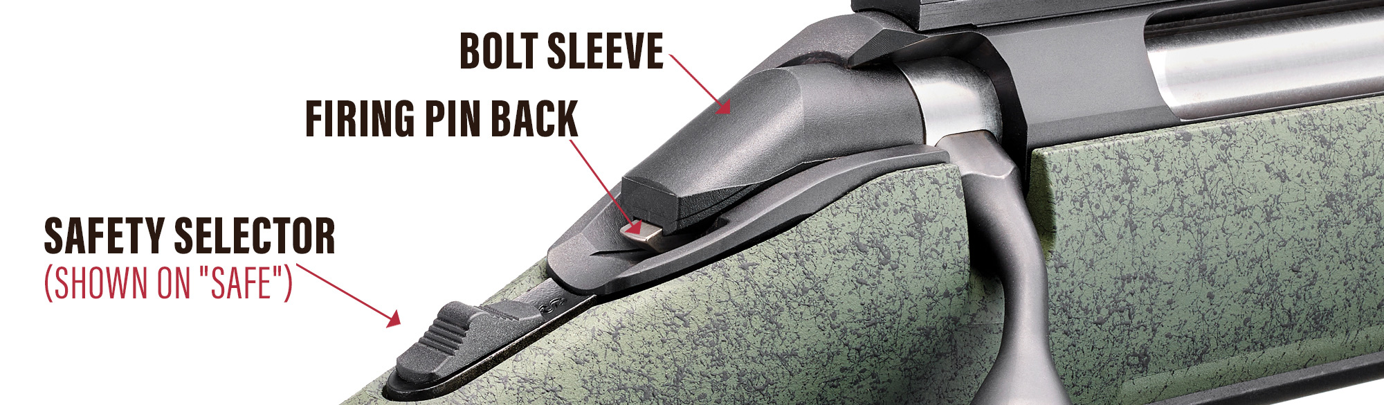 The Model A rifle features a two-position tang safety. The safety selector is located behind the bolt sleeve. The safety selector can only be moved from the "FIRE" position to the "SAFE" position when the firing pin is cocked. The firing pin can be cocked by fully raising the bolt handle. When it is cocked, the firing pin back will protrude from the bolt shroud. (See Safety 1.) With the rifle unloaded, practice moving the safety selector between the two positions until you know the position of the safety selector for the two modes – "FIRE" and "SAFE." (See Safety 2 & 3.)