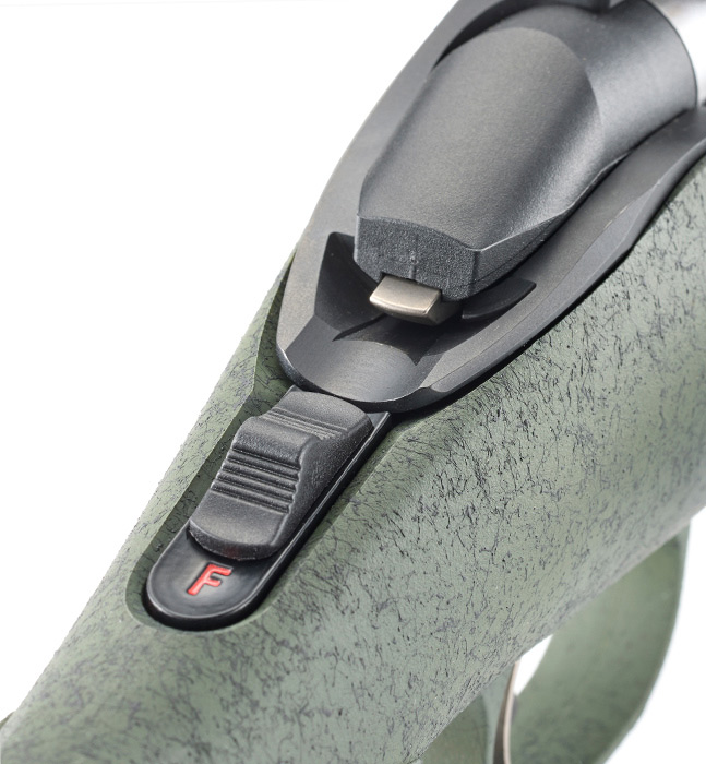 Other notable features of the Model A rifle include: a user-adjustable trigger; two-position tang safety; a fast lock-time fire control mechanism; a detachable magazine; a patented bedding system; and sling swivel studs.