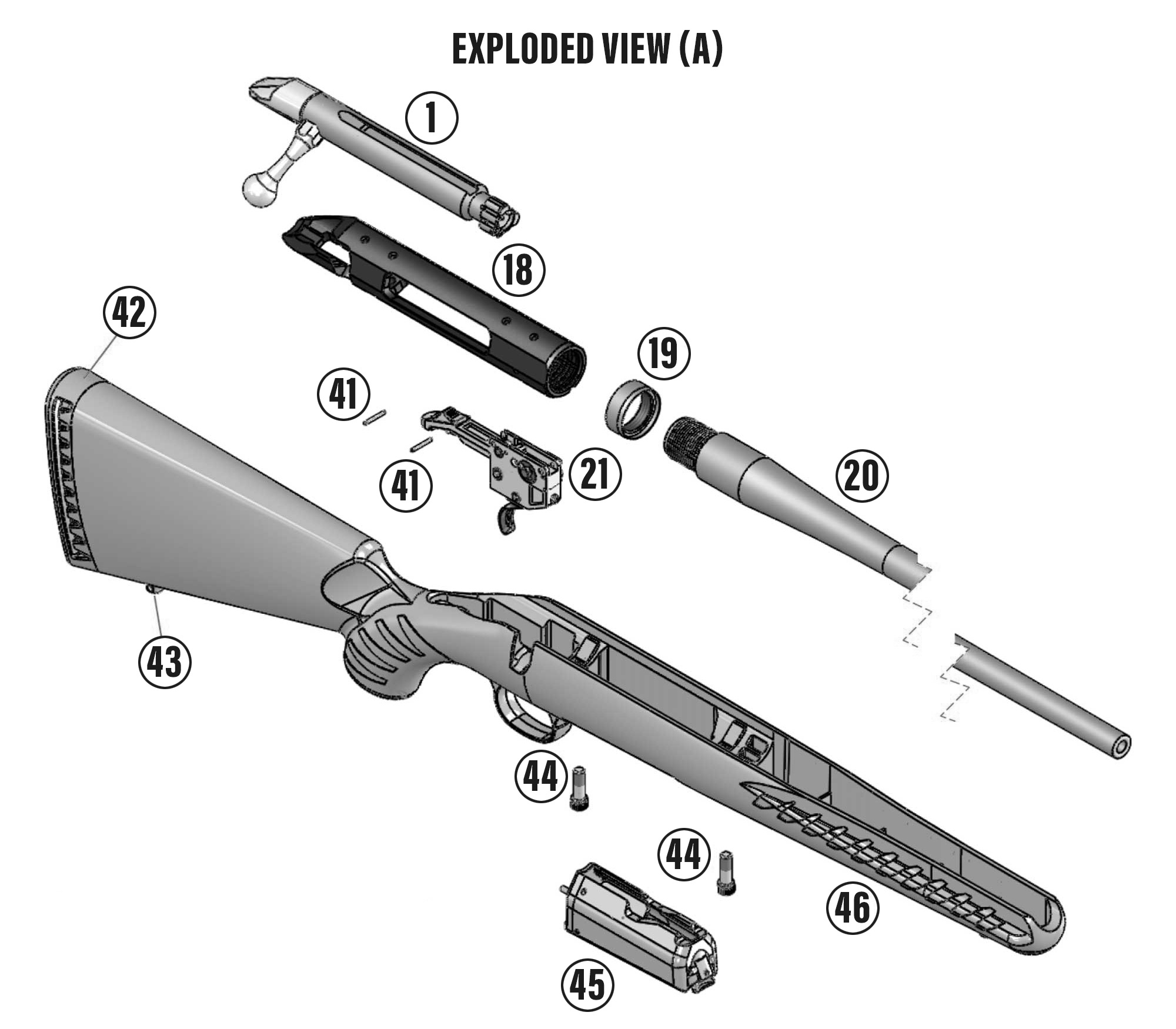 The Model A rifle is a bolt-action, magazine fed, repeating rifle. The receiver of the Model A rifle is fitted with a Picatinny scope base that readily accepts compatible scope rings, scope mounts, and optics.